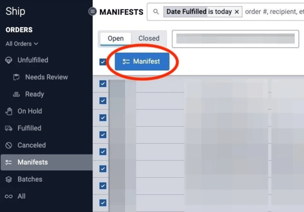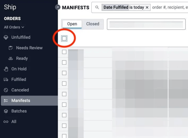 - Click the checkbox to select all orders that need to be included in the manifest.