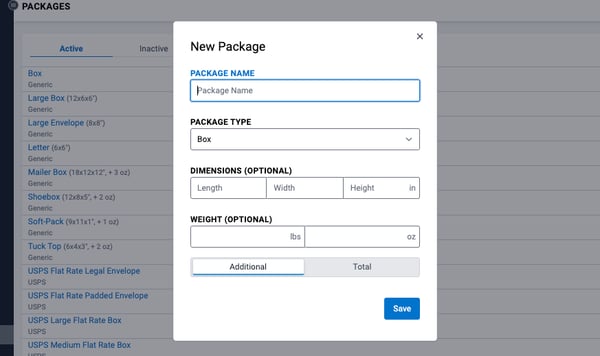 Once all required fields are complete, click Save. Your new package will now be available during the shipping process.