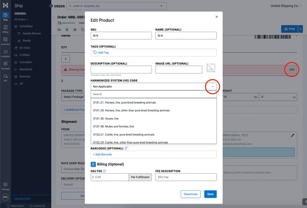 Locate and click Edit next to “Missing Harmonized System (HS) Code.”